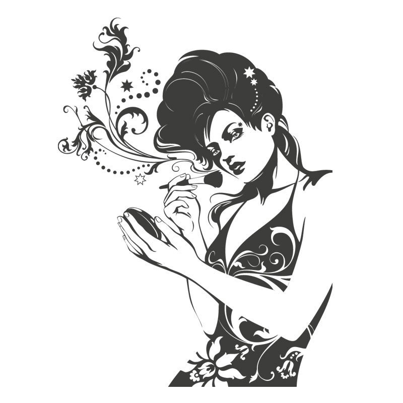 El glamour y el estilo se dan la mano en este vinilo decorativo, con fuerza y personalidad, en el una moderna chica se maquilla llenando de motivos florales nuestra pared.