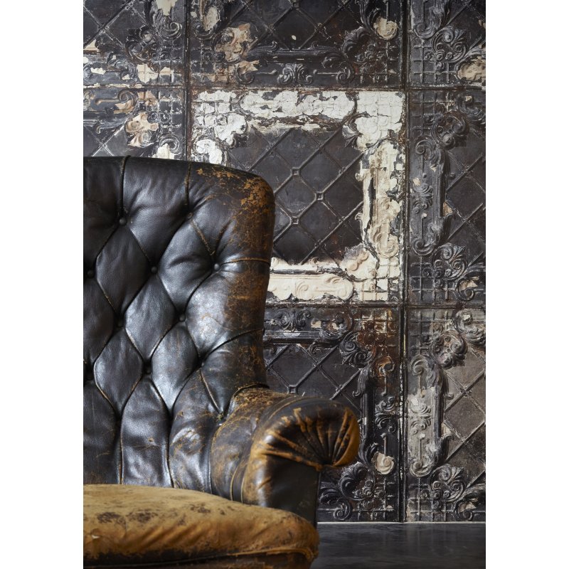 Espectacular papel pintado que reproduce, con un realismo increible y efecto 3D, los grandes artesonados neoclásicos (de 49 cm de lado) realizados en hojalata que se instalaban en los techos de los edificios de brooklyn tras la independencia americana, y que imitaban a artesonados de maderas policromadas.