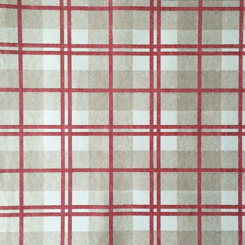 Papel pintado de un clásico y estilizado tartan en tonos beiges y cremas con rayas rojas.