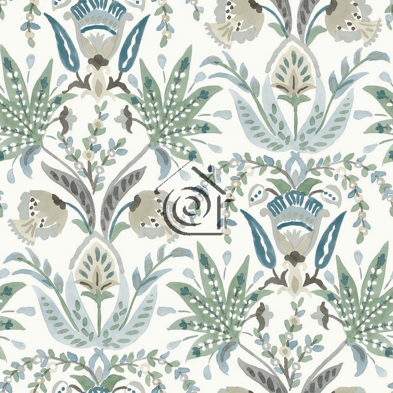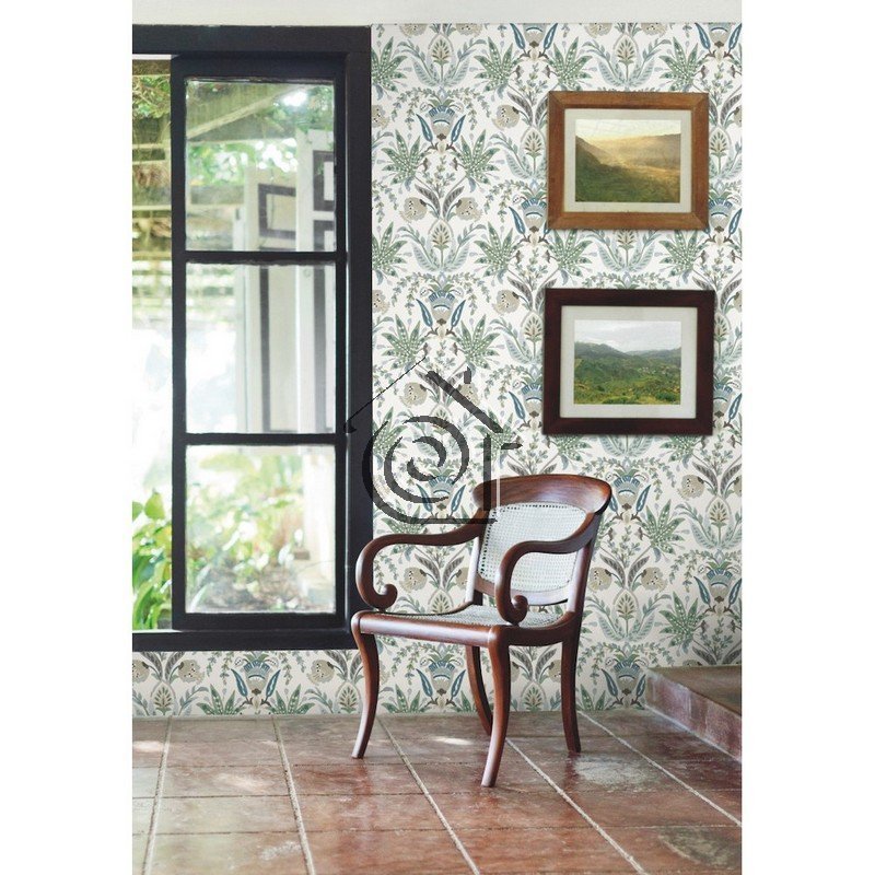 Papel pintado MN1910 Seaside Jacobean en color blanco, verde y azul de la colección Mediterranean de York Wallcoverings.