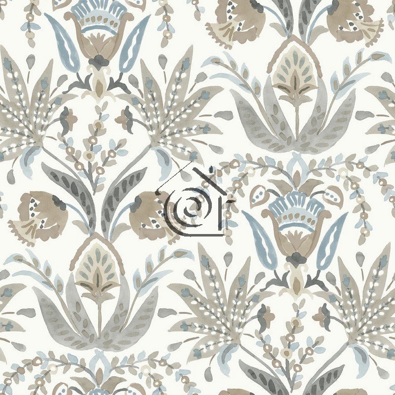 Papel pintado MN1915 Seaside Jacobean en color blanco, topo y azul de la colección Mediterranean de York Wallcoverings.