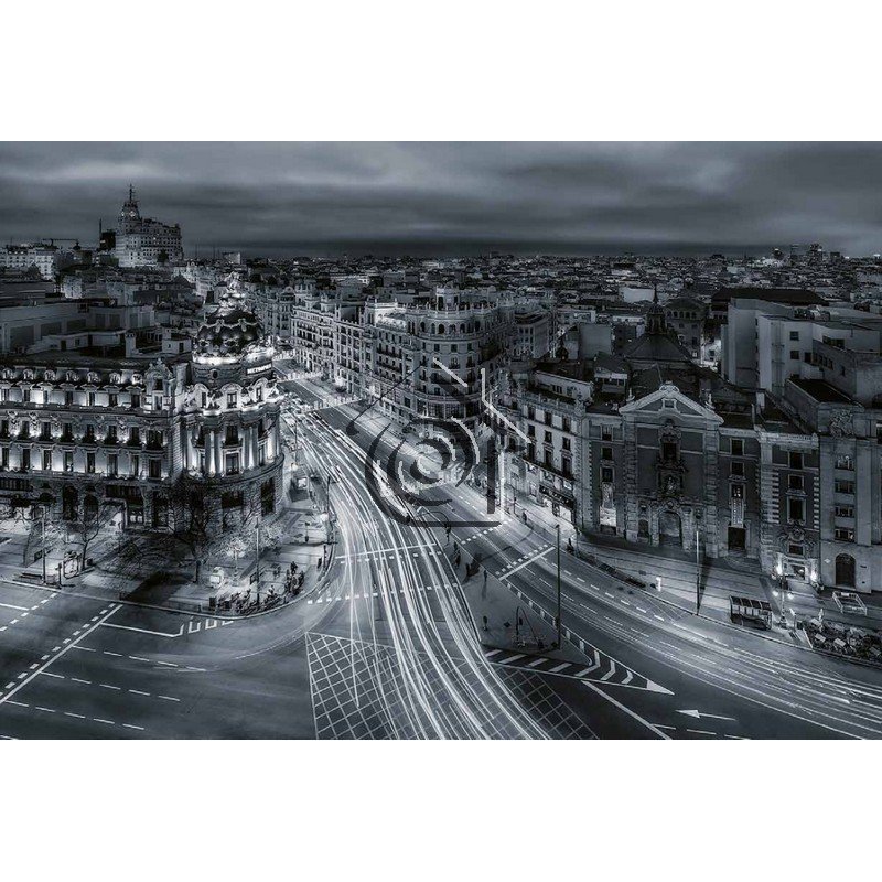 La ciudad de Madrid por la noche en blanco y negro. De la colección Urban de Comercial Cardoso.