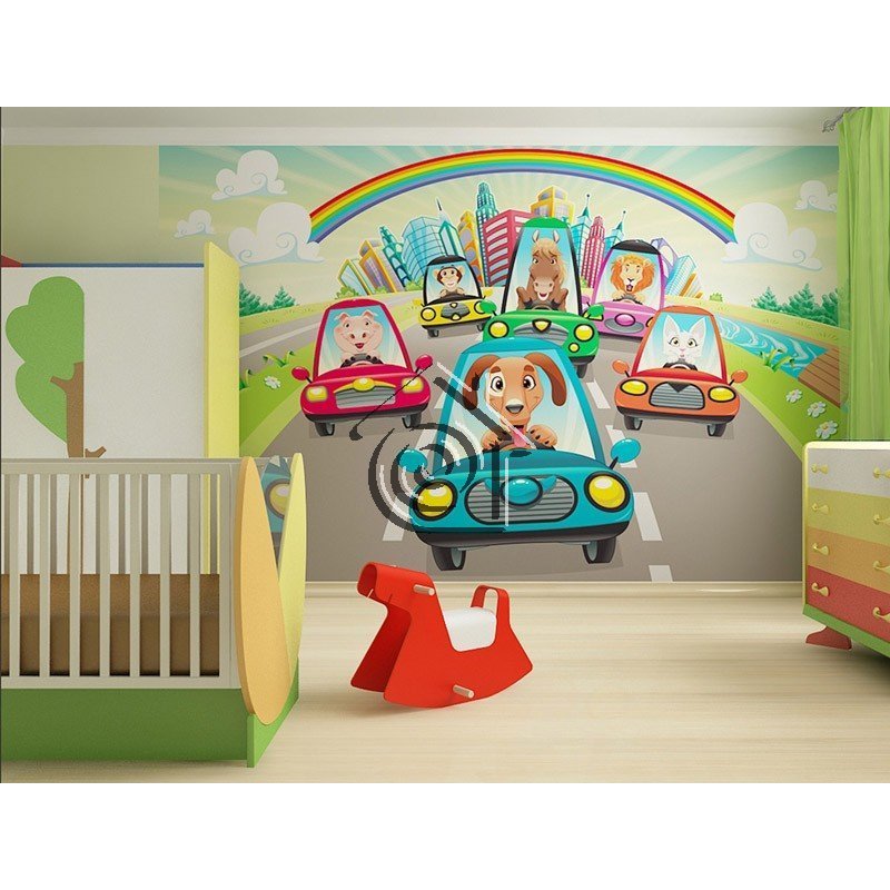 Fotomural infantil representando a unos coloridos y alegres coches conducidos por animalitos. Este fotomural es ideal para decorar las habitaciones de los mas pequeños del hogar.