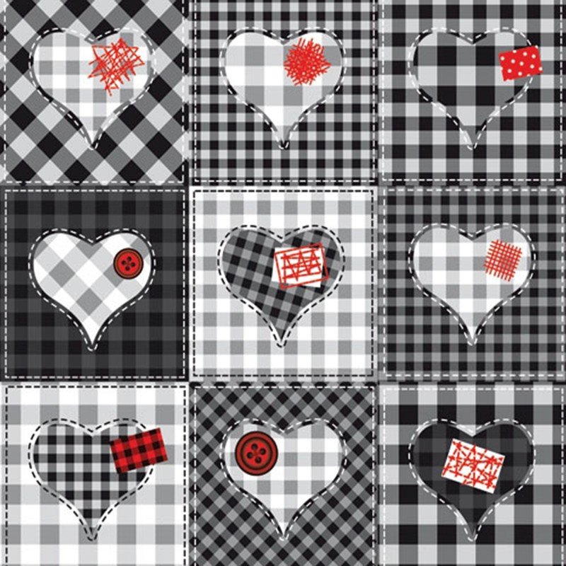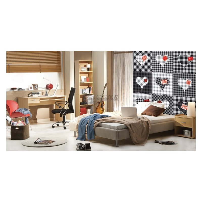 Crea un ambiente juvenil pop-chick en tu habitación con este excelente fotomural de Olly inspirados en parches de color negro y blanco de rayas con corazones de la casa Iberostil.