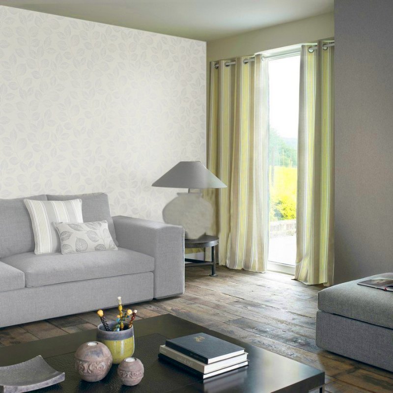 Papel pintado de hojas en color gris claro sobre fondo blanco roto, de estilo romántico. Perfecto para empapelar habitaciones con elegancia, vida y alegría.