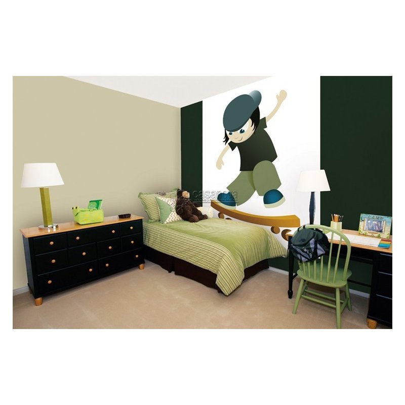 Fotomural ideal para habitaciones juveniles con dibujo que recrea un personaje haciendo skate callejero. Tamaño: 232.5 cm x 270 cm