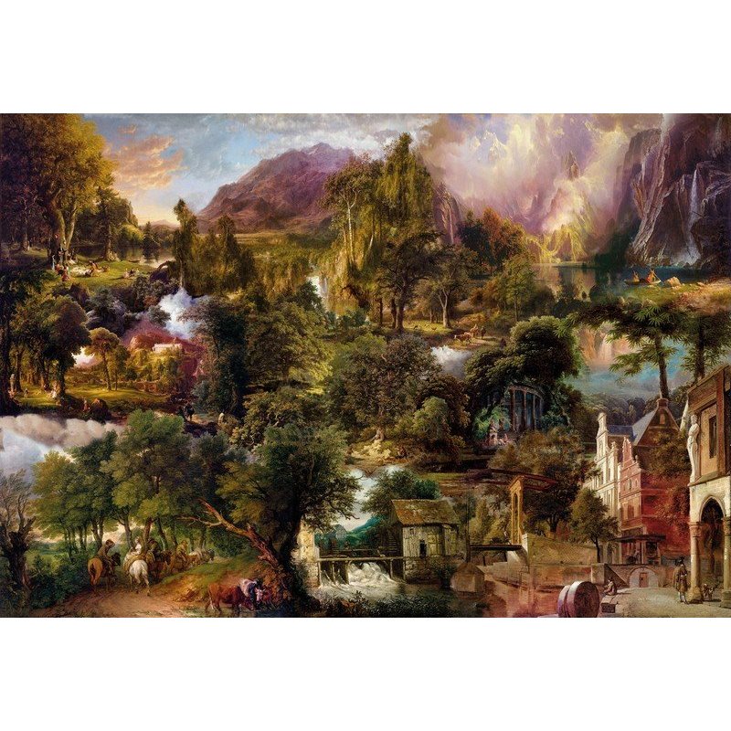 Las pinturas de paisajes históricos se funden en una composición romántica en tonos apagados.