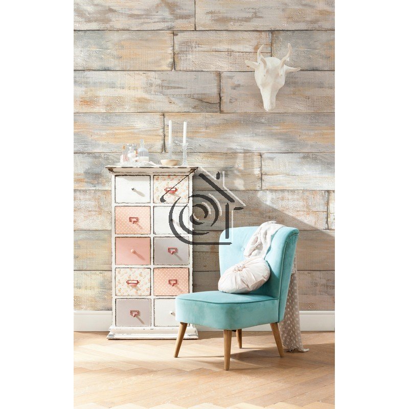 Pared de madera desgastada con un toque chic que da un guiño casual al nuevo romanticismo.