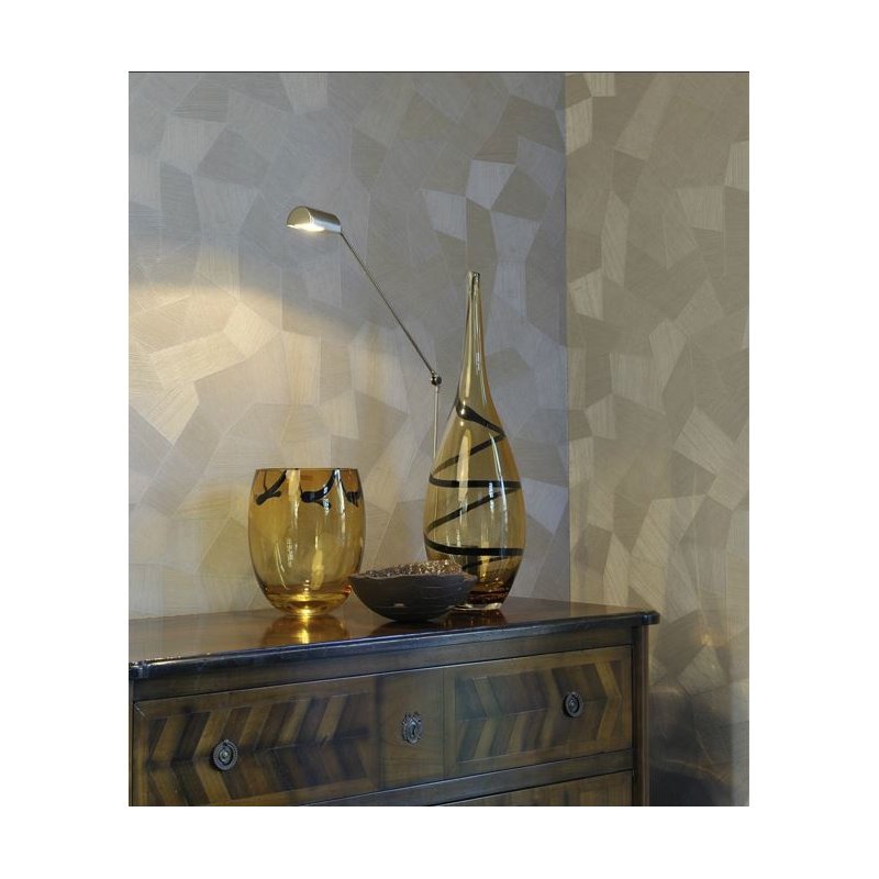 Papel pintado de la colección Monsoon de Arte con un diseño de figuras geométricas de color café que imitan a una vidriera.
