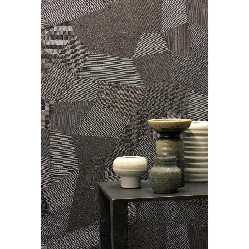 Papel pintado de la colección Monsoon de Arte con un diseño de figuras geométricas de color marrón oscuro que imitan a una vidriera.