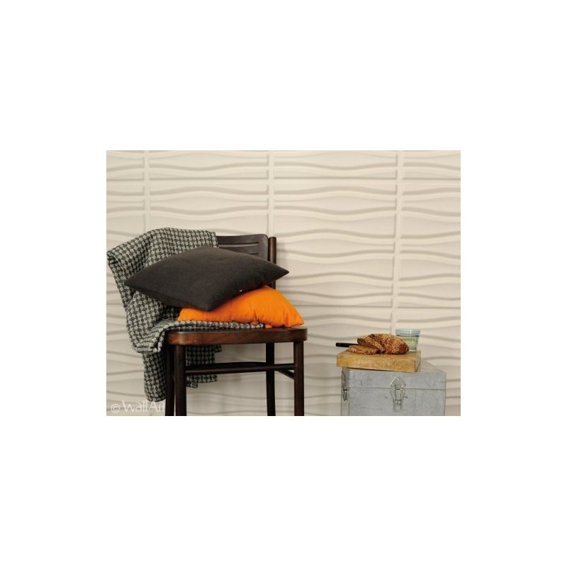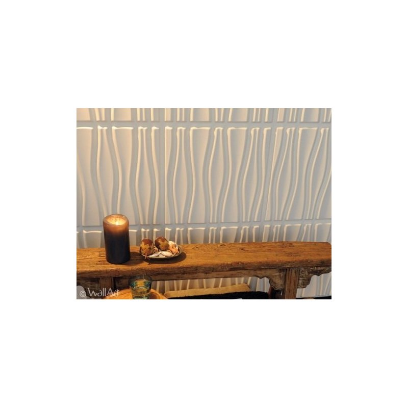 Producto natural reciclado de fibra de caña de azucar. Se fija en la pared con pegamento WAllArt (1 bote cada 4 láminas) produciendo un efecto tridimensional.