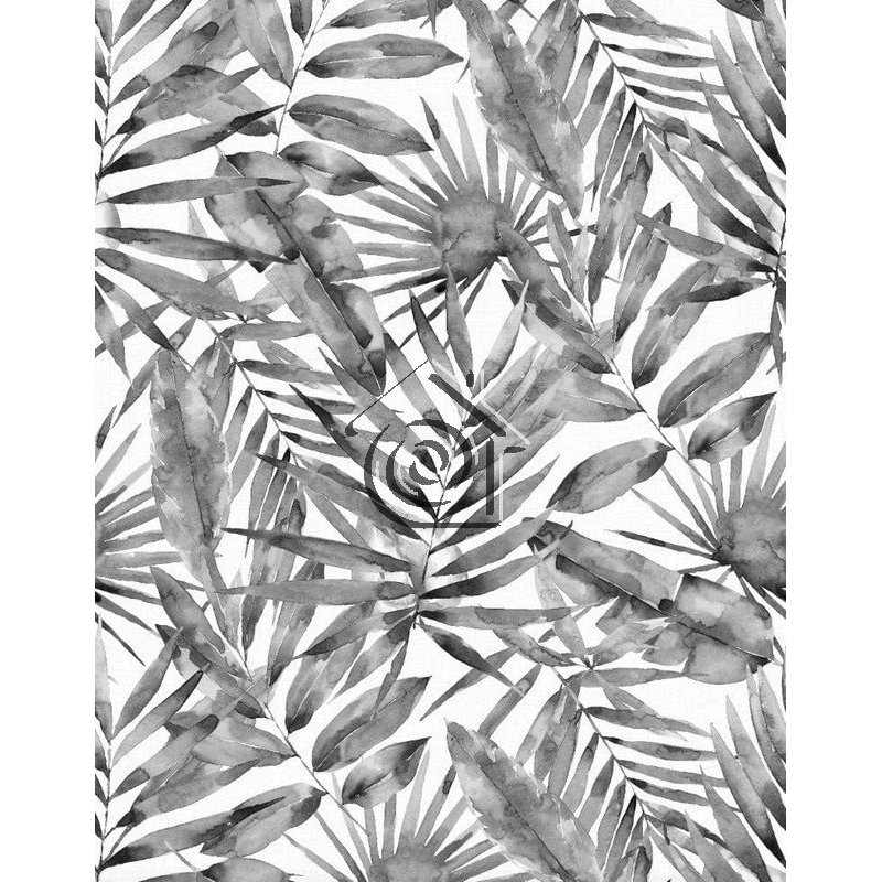 Fotomural mate de estilo romántico con influencia actual, en el que podemos ver, sobre fondo blanco, un diseño gráfico de hojas de la selva con líneas negras, como pintado con pluma o rotulador.