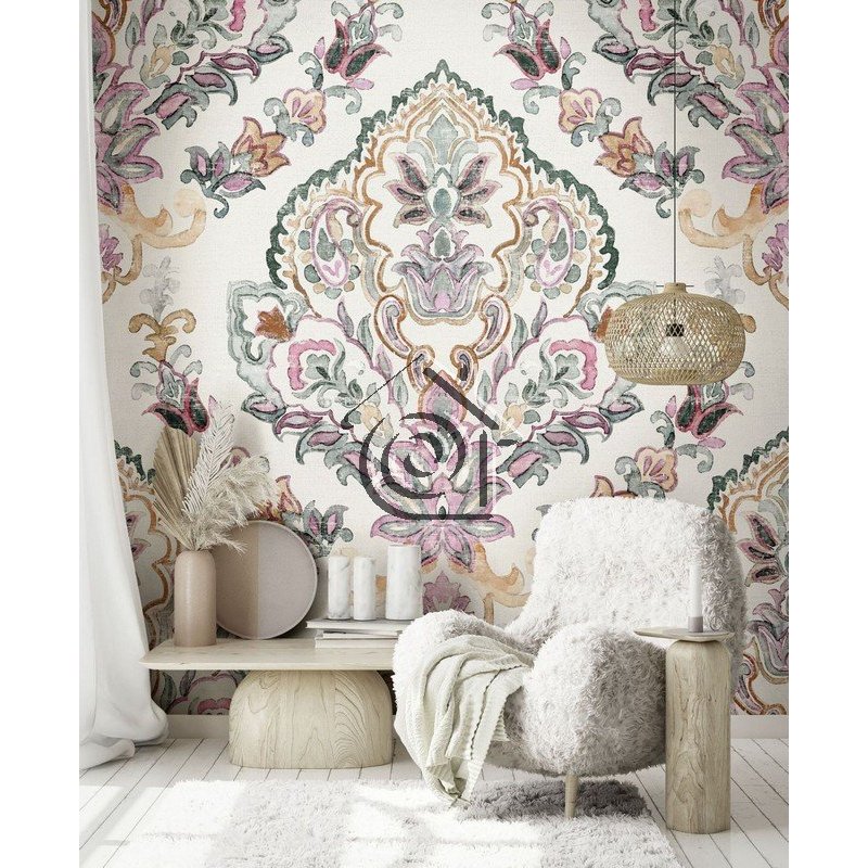 Fotomural mate, de estilo colonial hindú, con fondo imitando arpillera blanca de trama grande, con dibujo de un paisley o medallón de flores y cachemires en el que predomina el rosa, el verde y el camel.