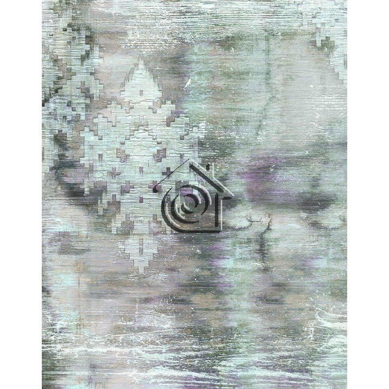 Fotomural mate de estilo boho chic con influencia colonial, en el que podemos ver, un fondo que imita a una vieja pared estucada en tono gris, marrón y piedra, sobre el que destaca un dibujo simétrico con ligero relieve óptico, que simula ladrillos grises dispuestos en patrón geométrico que recuerda a las formas de las alfombras asiáticas.