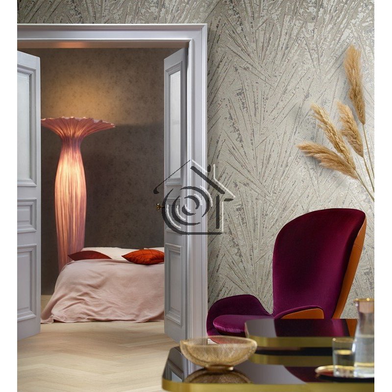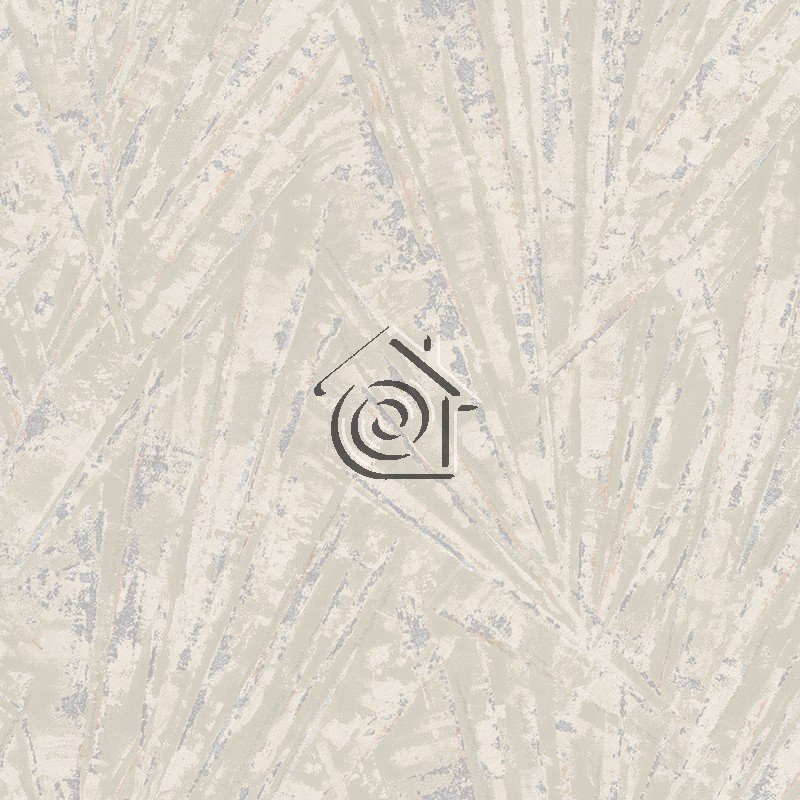 Papel pintado con textura original que imita una impresión de hojas de palmeras en color arena, con destellos metálicos sobre un fondo de piel de potro blanca mate y manchas plateadas.