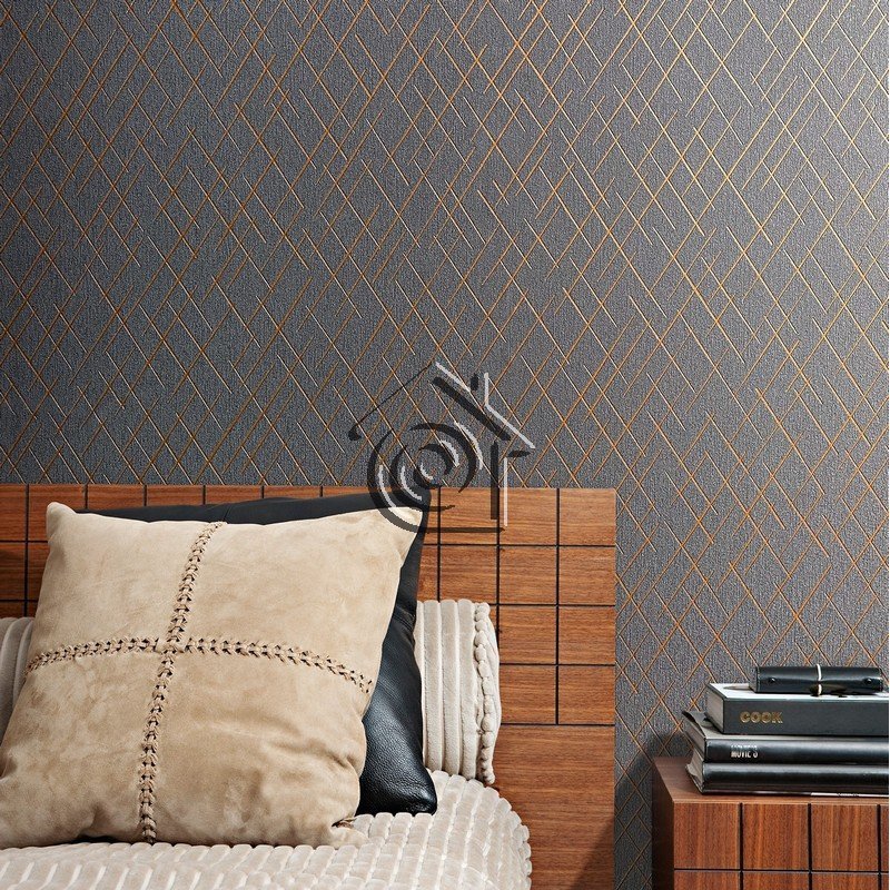 Papel pintado textura textil con fondo verde grisáceo y líneas en color oro.