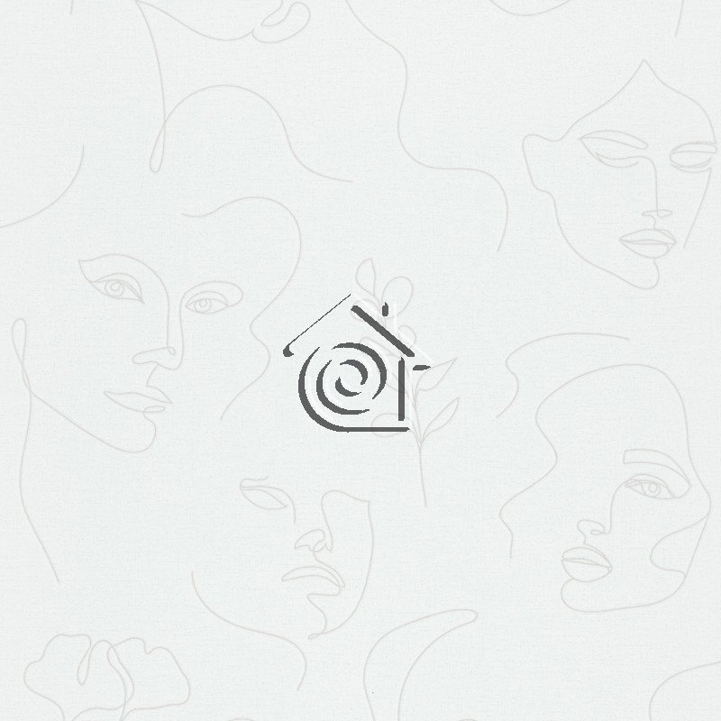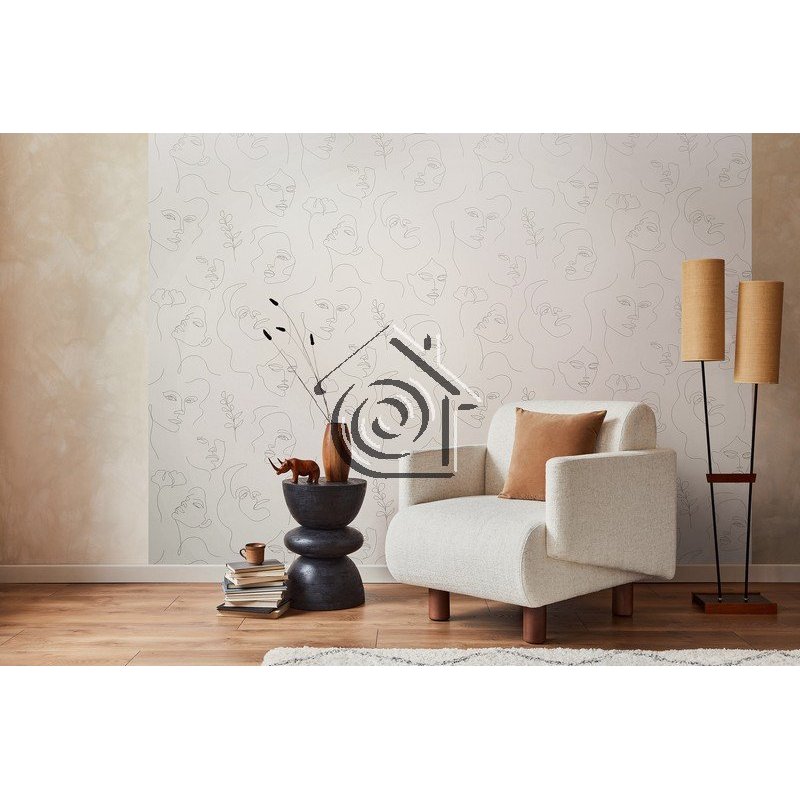 Papel pintado imitación de tela batista blanca mate, con dibujo de siluetas de rostros de mujer en color nácar.