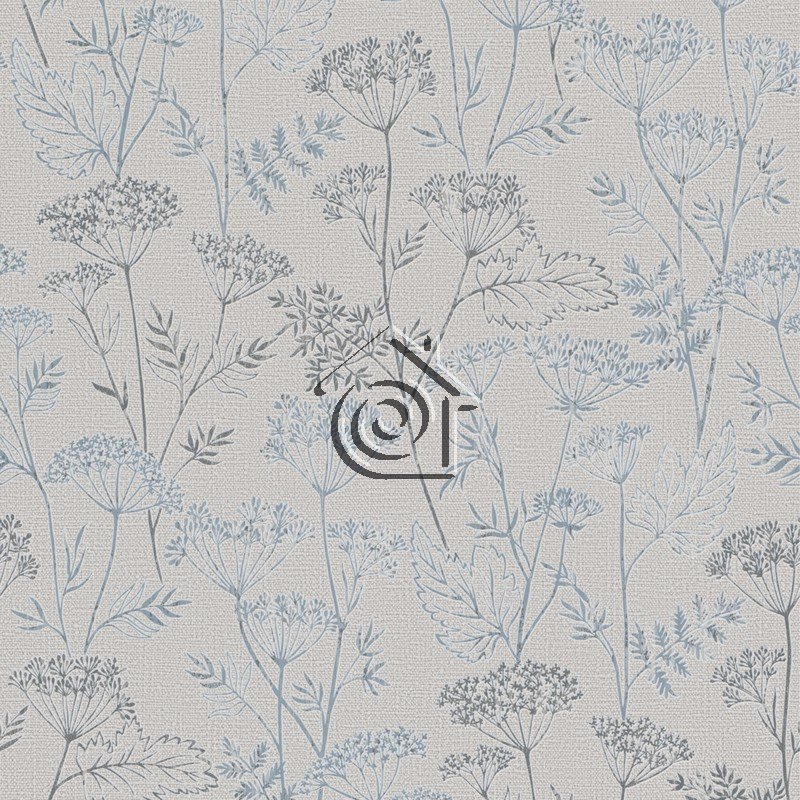 Papel pintado imitación de arpillera gris mate y dibujo de hojas románticas en color azul y gris oscuro.