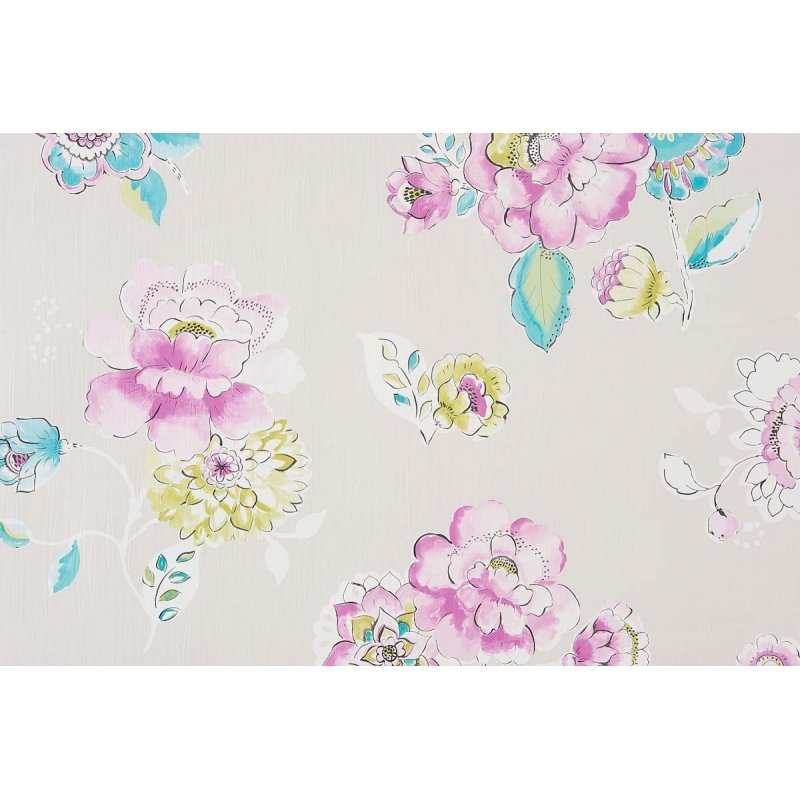 Papel pintado de flores en tonos rosas, verdes y azules sobre un fondo piedra con una suave textura de rayas.