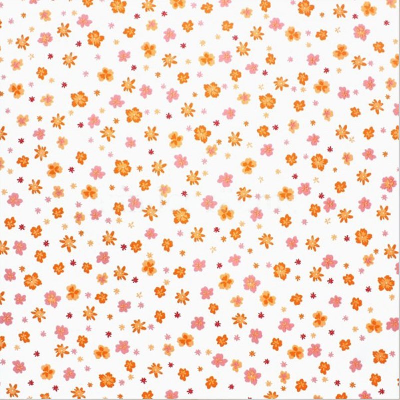 Papel pintado de flores naranjas estilo liberty sobre un fondo blanco roto. Es un papel mate sin relieve, las flores miden entre 1.5 cm y 0.5 cm.