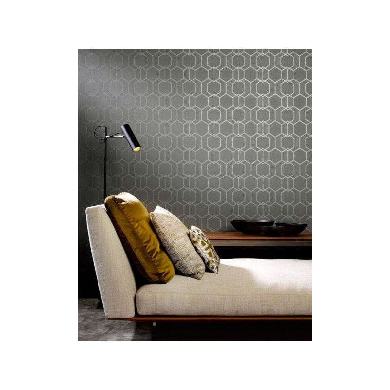 Papel pintado geométrico que forma hexágonos de aspecto retro con un fondo marrón y lineas plateadas.