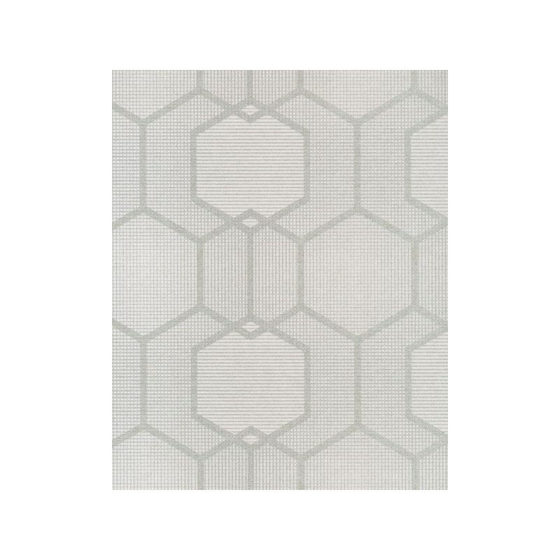 Papel pintado geométrico que forma hexágonos de aspecto retro con un fondo blanco y lineas plateadas.